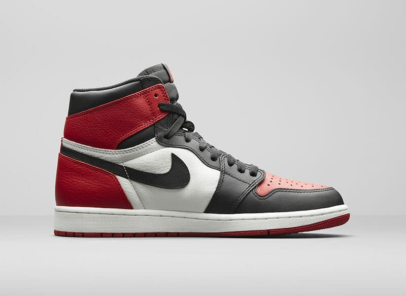 Très proche de la Black Toe, la Air Jordan 1 Bred toe se démarque de par sa toebox rouge en lieu et place du blanc et une languette noire. Le placement de couleurs est donc similaire à la Shattered Backboard sortie en 2015, avec une tonalité de rouge plus sombre.