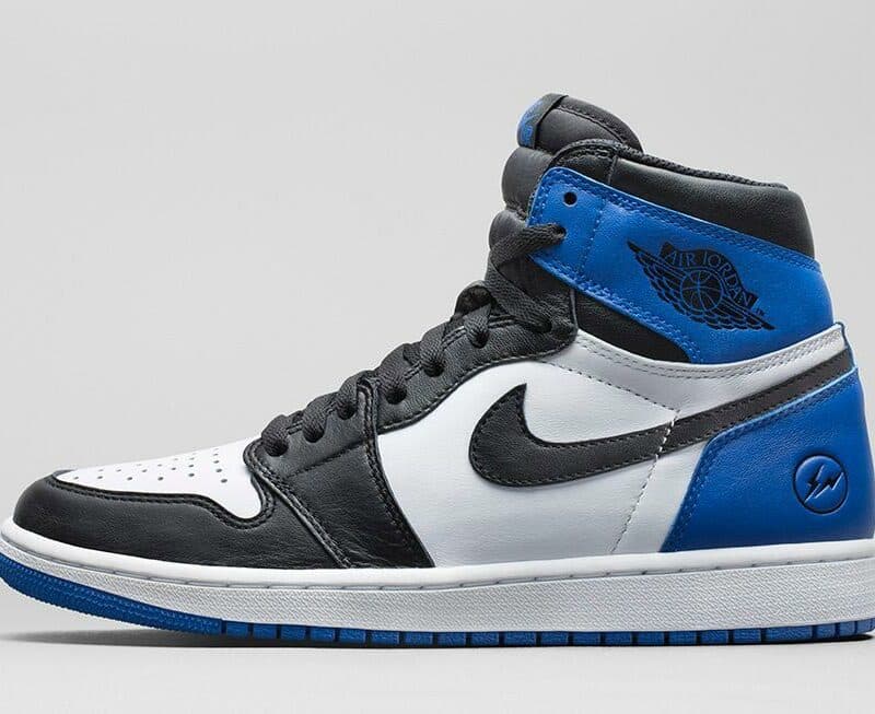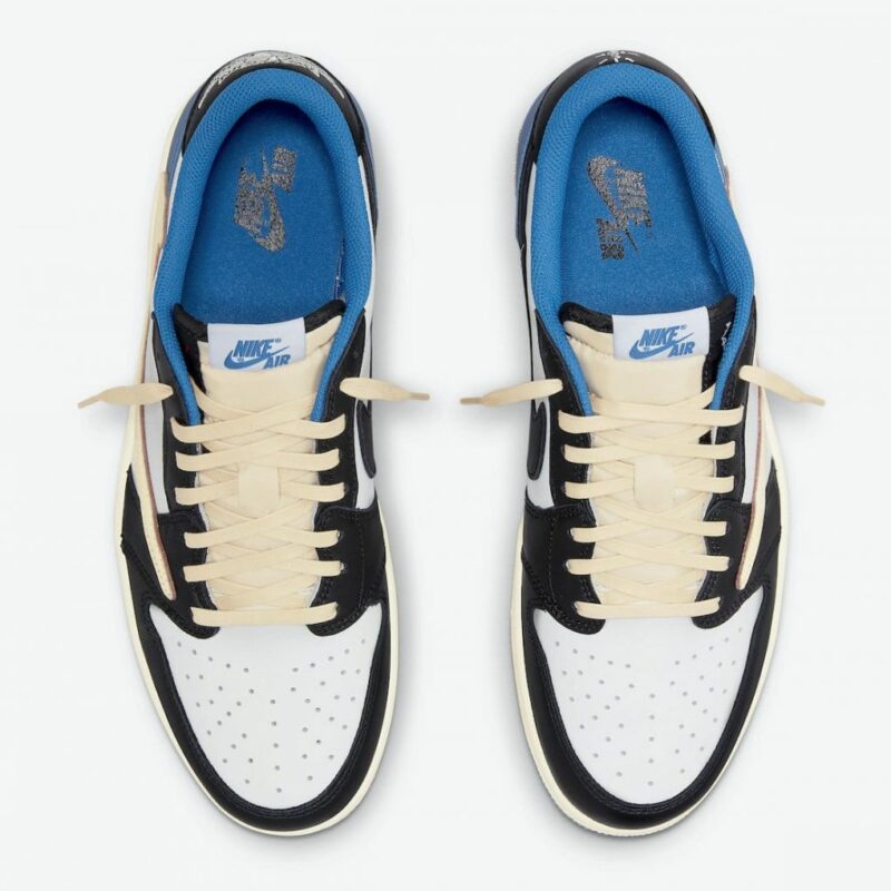 Fruit d’une collaboration très attendue, la Travis Scott x fragment x Air Jordan 1 Low OG reprend le colorway signature de fragment design sur une structure en cuir premium mêlant blanc, bleu et noir. Elle se distingue par le swoosh inversé crème, signature de Travis Scott, parfaitement assorti à la midsole et aux lacets. Les co-brandings fragment et Cactus Jack au talon viennent parfaire ce design exclusif. Très recherchée, la paire s’échange כיום entre 1 500 € et 2 000 € selon la pointure.