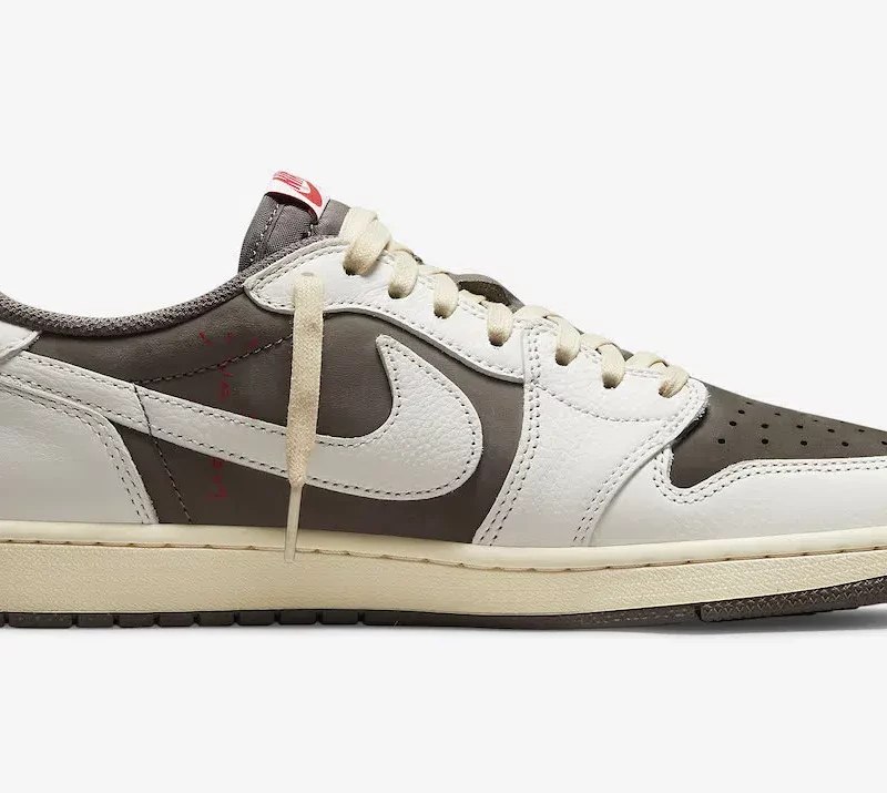 Cette édition iconique se distingue par le swoosh inversé surdimensionné en cuir grainé crème, signature de Travis Scott. Il repose sur une tige en nubuck marron sublimée par des empiècements en cuir blanc. Les lacets crème, assortis à la midsole, renforcent l’esthétique vintage, tandis que le co-branding rouge sur la languette apporte un contraste marqué. Les détails Cactus Jack ornent les panneaux intérieurs et les heeltabs aux côtés du logo Wings. Une outsole marron vient parfaire l’ensemble. La paire est livrée avec des insoles illustrées et une special box. Prix actuel : entre 1 100 € et 2 000 € selon la pointure.
