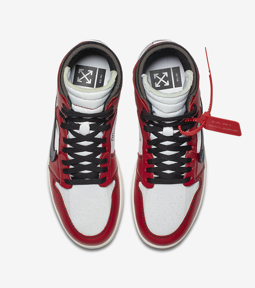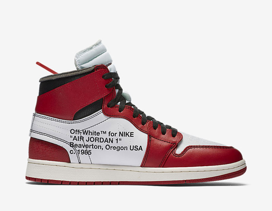 À travers cette création, le talentueux designer, qui nous a quittés en 2021, revisite l’iconique sneaker. En effet, l’Air Jordan 1 Off-White présente une conception en cuir rouge et blanc, reprenant les couleurs des Chicago Bulls, avec un style déstructuré, agrémenté de nombreux détails dont des coutures bleues et oranges, ou bien l’inscription « Off-White For Nike… » sur le côté intérieur. Quatre sets de lacets différents où on peut lire « Shoelaces » accompagnent la paire.